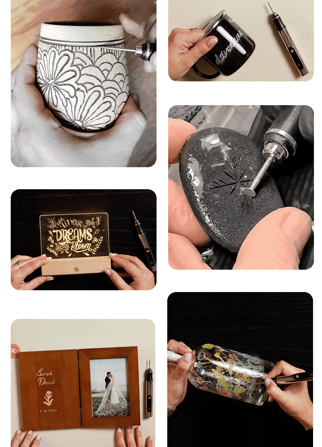 Ontspan en laat je creativiteit stromen. Met slechts drie eenvoudige stappen geniet je van de voldoening van het maken van iets unieks dat helemaal van jou is. De Zengraver Engraving Pen maakt het moeiteloos om creaties te maken waar je niet alleen dol op zult zijn, maar die ook indruk zullen maken op iedereen die ze ziet.